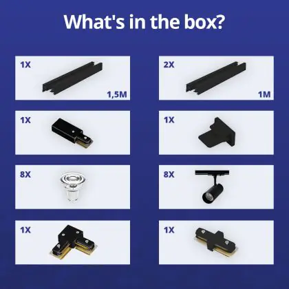 | Fabrikantnaam | Complete L shaped 1-Phase Track Set Black incl. 8x Spot fixture + GU10 2700K 3W Dim – 1,5 x 2 meter | |