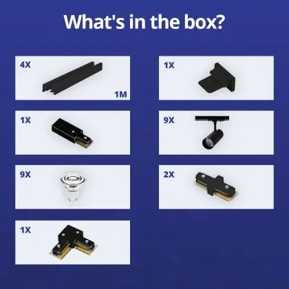 | Fabrikantnaam | Complete L shaped 1-Phase Track Set Black incl. 9x Spot fixture + GU10 2700K 3W Dim – 2 x 2 meter i | |