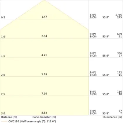 De lichtopbrengst (Lumen), geeft weer hoe krachtig het uitgestraalde licht is. Dit is belangrijk om te weten om de juiste sfeer te creëren. 0 tot 400 Lumen is bij uitstek geschikt voor accent- of sfeerverlichting. Een hoger aantal Lumen is, afhankelijk van de grootte van de ruimte, beter geschikt als ondersteunende- of basisverlichting. Heb je plafonds hoger dan 4 meter, dan is een lichtopbrengst van minimaal 8000lm aan te raden indien heldere verliching gewenst is (vb. in werkomgevingen).